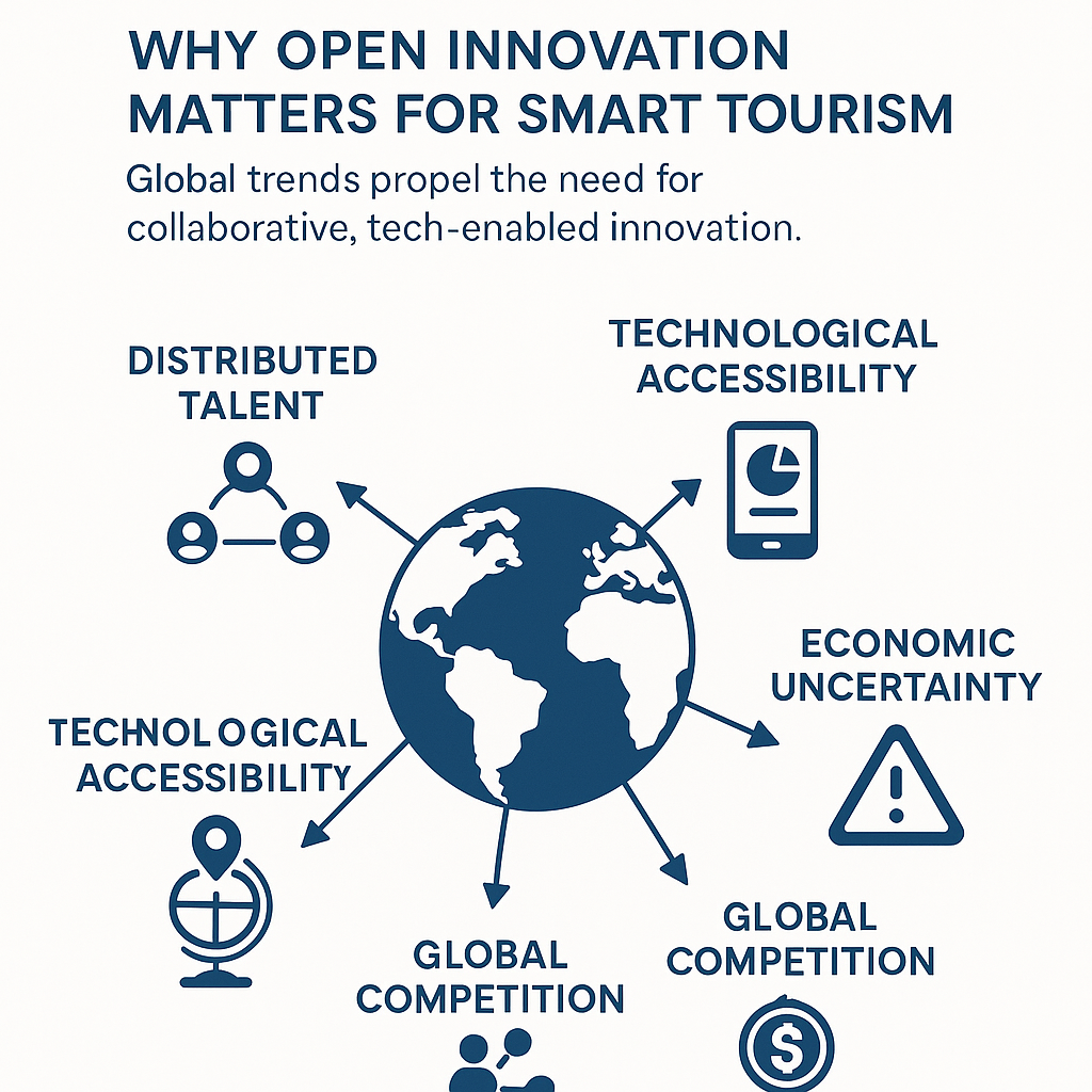 En el contexto del turismo inteligente, la innovación no puede permanecer confinada dentro de los límites organizativos tradicionales. El panorama global está siendo remodelado por una serie de tendencias importantes que exigen modelos de innovación más fluidos, inclusivos y colaborativos. Estas tendencias, arraigadas en la transformación social, tecnológica y económica, no solo están acelerando el ritmo del cambio, sino que también están amplificando la necesidad de una innovación abierta. A continuación, exploramos las fuerzas globales clave que hacen que la apertura no solo sea ventajosa, sino esencial.
