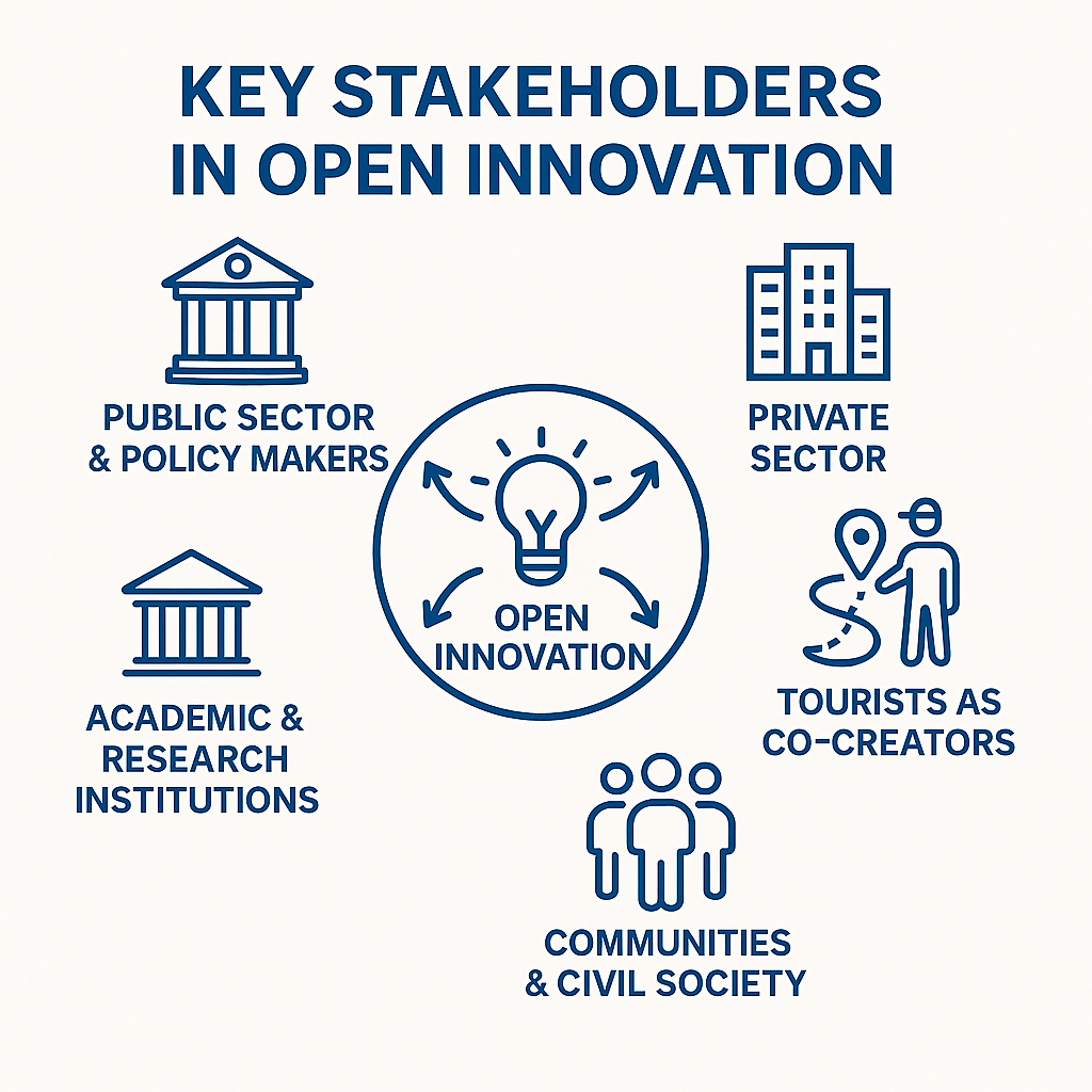 En el turismo inteligente, el sector público desempeña un papel clave en la configuración de ecosistemas de innovación abiertos y colaborativos alineados con los objetivos regionales a largo plazo. Los gobiernos y los responsables políticos actúan como facilitadores y promotores mediante el establecimiento de marcos normativos, infraestructuras y asociaciones que apoyan la cocreación y la experimentación entre sectores.