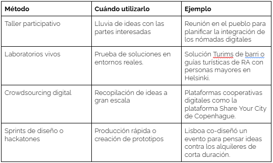 El turismo tradicional suele imponer modelos descendentes, como resultados obtenidos sin la participación local, mientras que la cocreación de soluciones implica a los residentes en el proceso de toma de decisiones y garantiza que los proyectos sean beneficiosos para la comunidad local. Los beneficios pueden ser la solución a los problemas a los que se enfrenta ese territorio (como la falta de conexión a Internet de alta velocidad) o la resolución de problemas reales causados por el turismo masivo, como la restauración de espacios degradados.