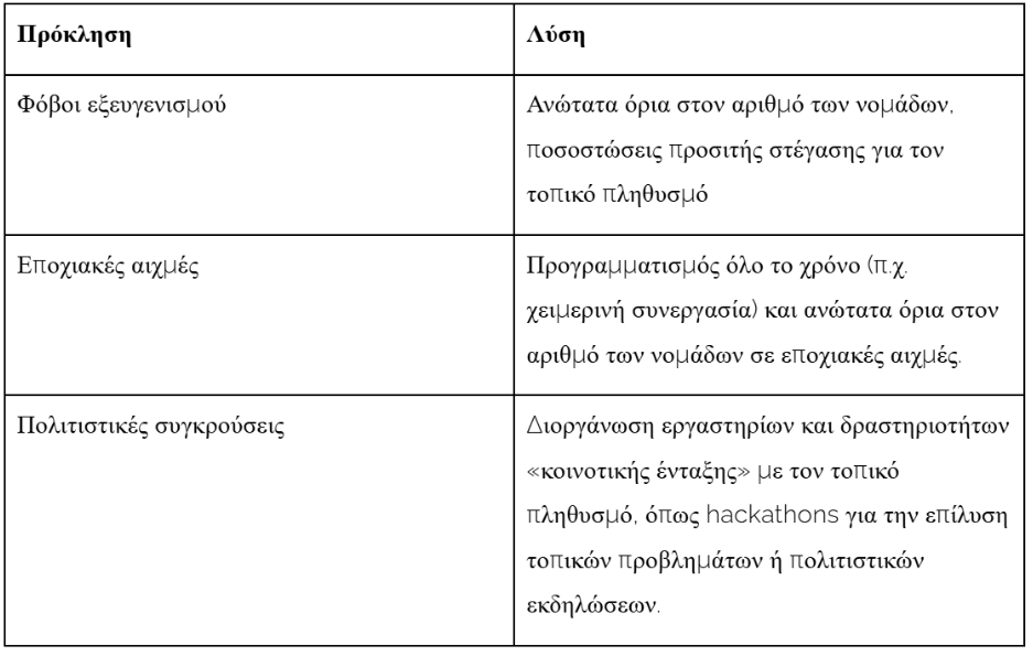 Ταυτόχρονα, η δημιουργία νομαδικών χωριών μπορεί να δημιουργήσει προκλήσεις και φόβους στον τοπικό πληθυσμό, όπως: