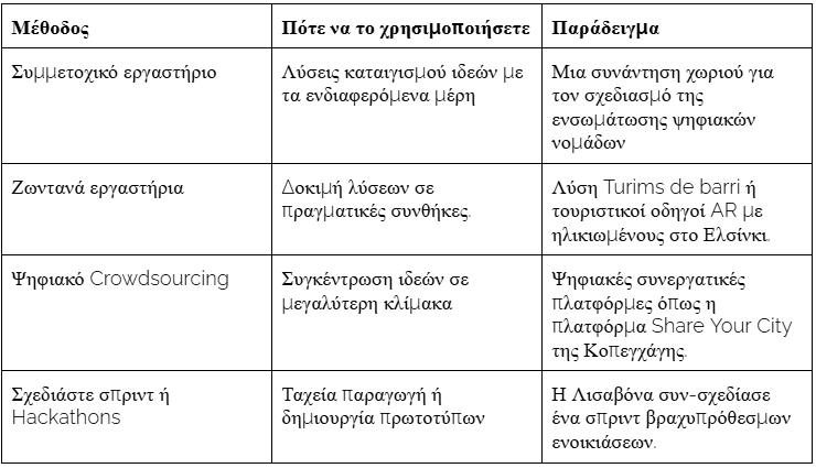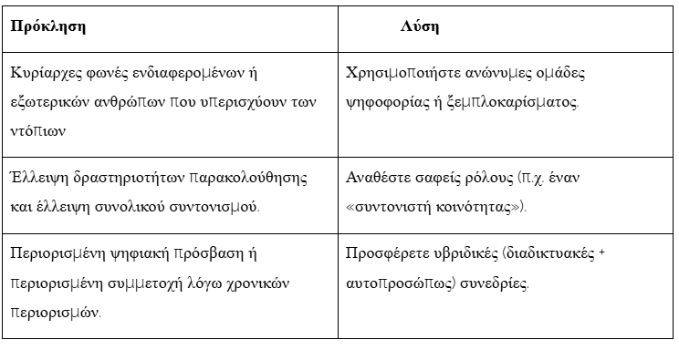 Σκεφτείτε πιθανά εμπόδια για τους συμμετέχοντες: εάν εφαρμόσετε ένα ψηφιακό εργαλείο, σκεφτείτε πώς να διευκολύνετε τη συμμετοχή χρηστών με χαμηλές ψηφιακές δεξιότητες.